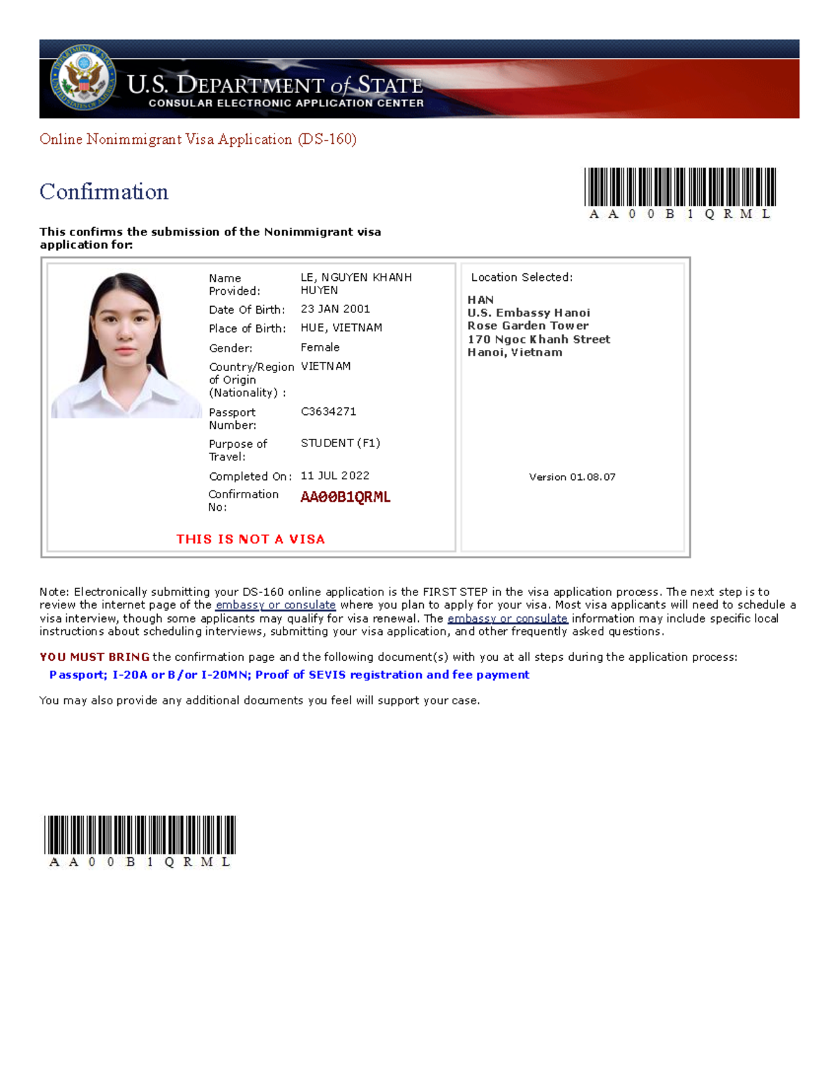 After successfully submitting the DS-160, you will receive a confirmation page with a barcode. This confirmation page is extremely important. You will need to print it and bring it with you to your visa interview. It serves as proof of your application submission and contains a unique barcode that consular staff will scan.